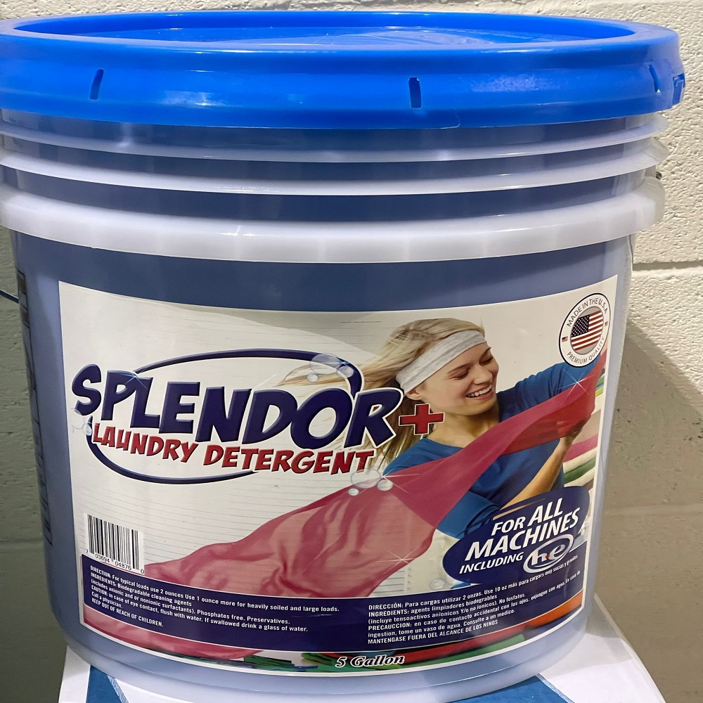 Splendor detergent is a Extra strength , concentrated laundry detergents, which designed for all types of heavily soiled fabrics that are not harmed by water and aggressive detergents . Splendor Laundry Detergent is comparable to higher priced retail detergent with fraction of the price . This versatile compound is also completely biodegradable and is recommended for use in all types of laundry equipment ( HE & Regular washers)